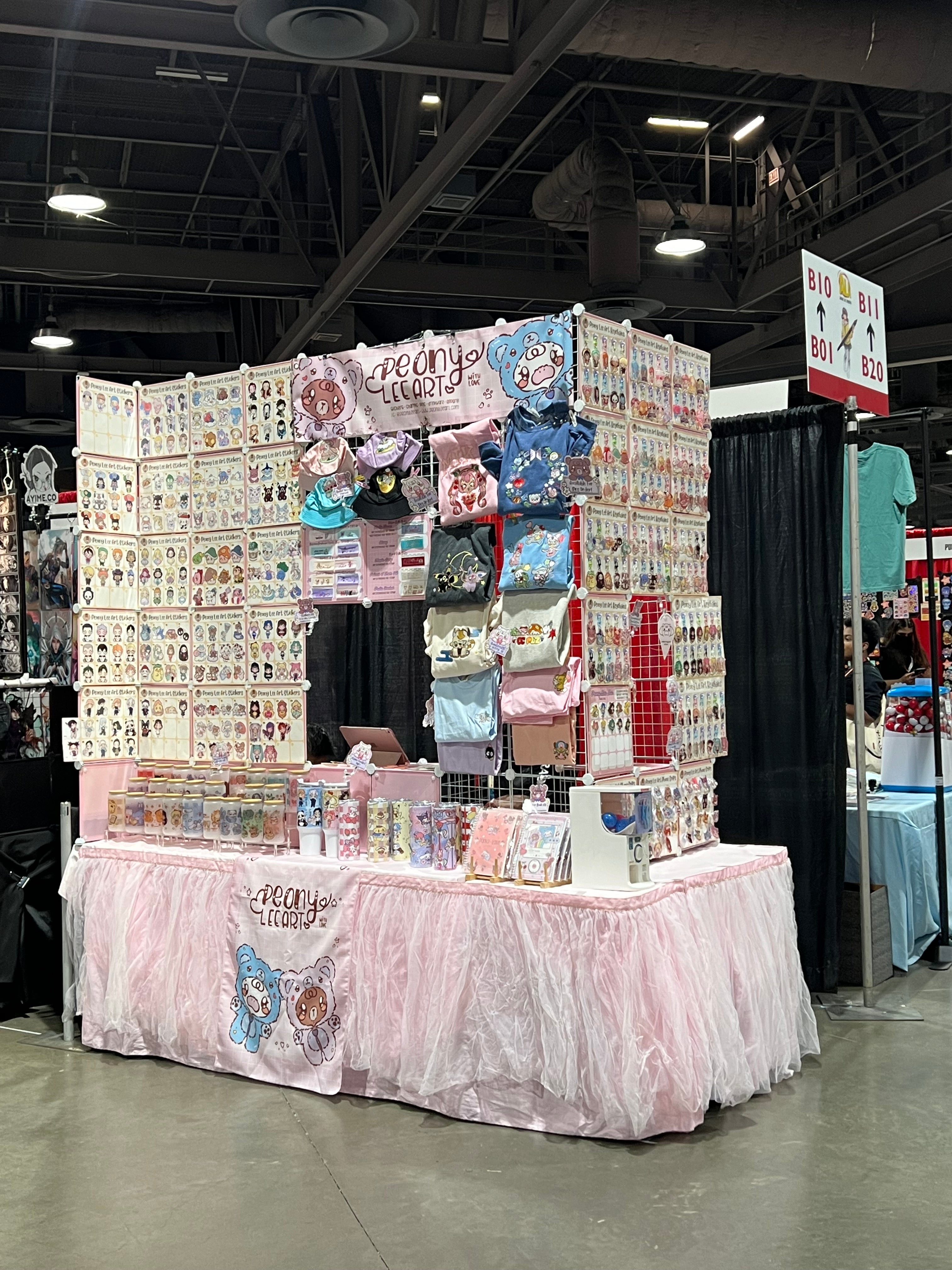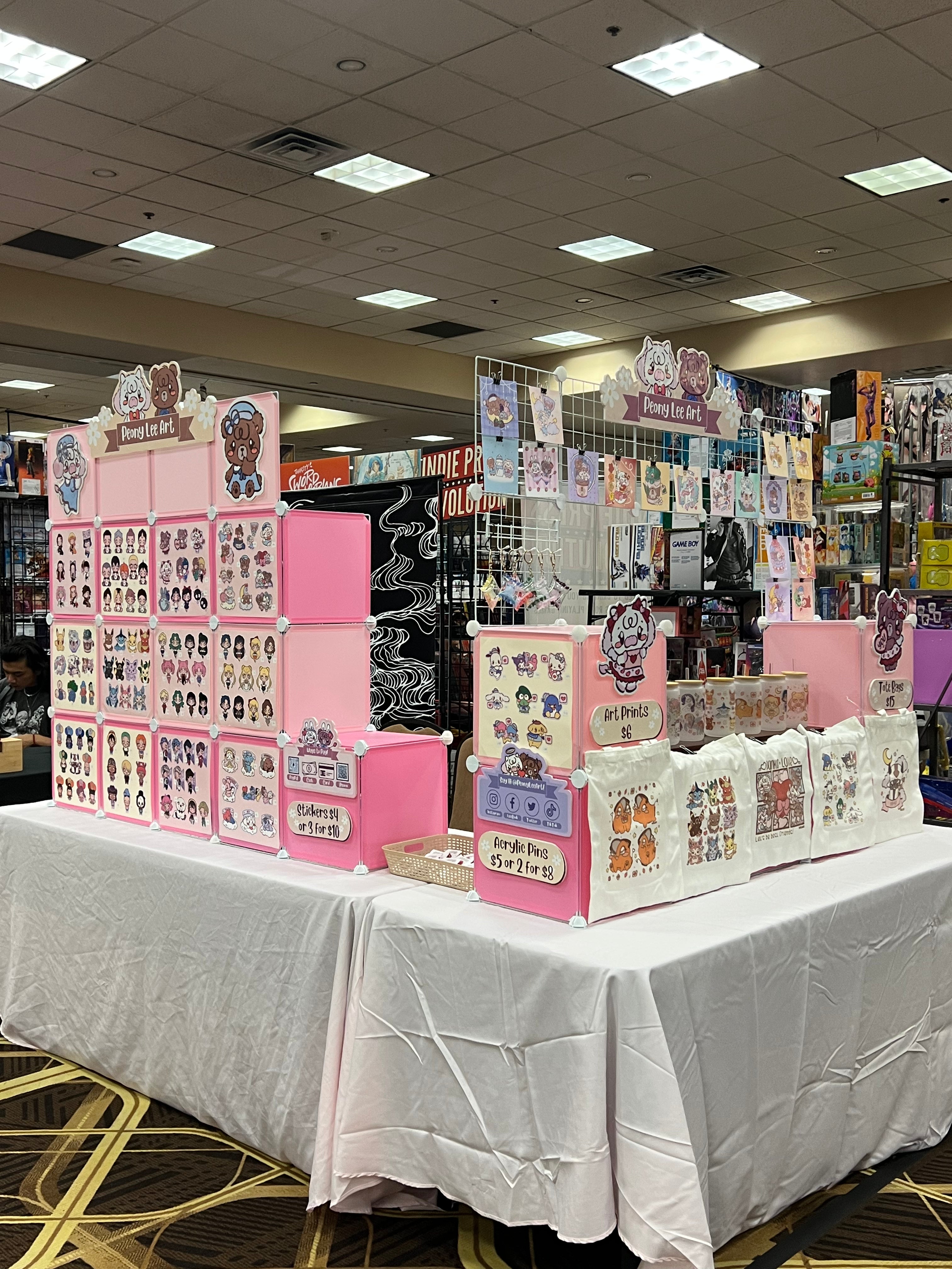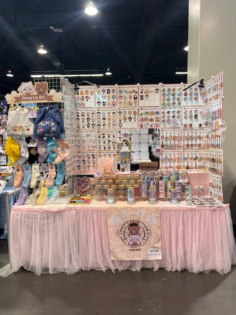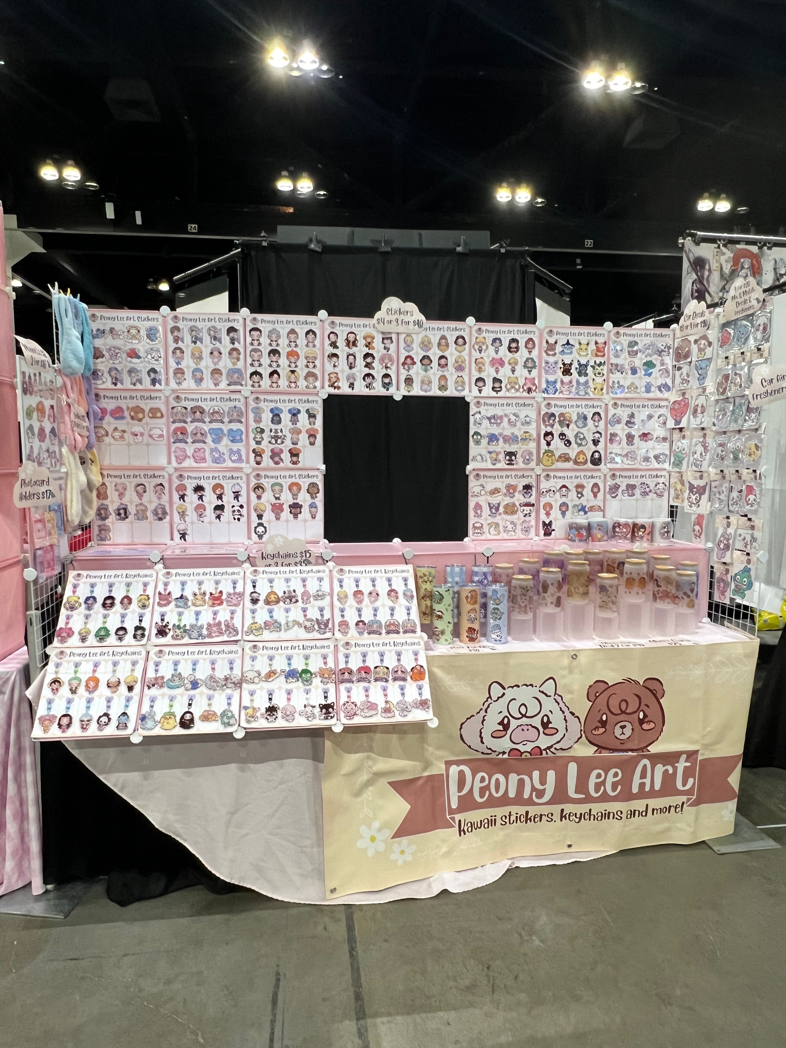 Peony Lee Art has been at events all around the Las Vegas area, as well as conventions in the Greater Los Angeles Metropolitan. Our set up ranges from a 4-foot indoor table all the way to a full 10x10 outdoor booth. A few of the most notable events we have been at include Anime Expo, 626 Night Market, Anime Los Angeles, OC Japan Fair, Anime Las Vegas, Anime Impulse OC, Asian Night Market LV, and LA Comic Con. You can find examples of our booth set up in the photos below, as well as a list of confirmed upcoming events by visiting our Events Calendar.