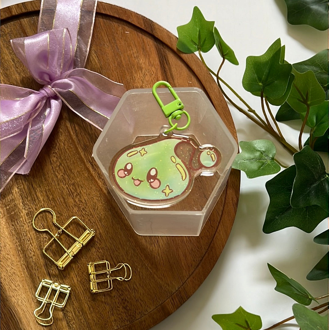 Info: Double-sided acrylic keychain with glitter epoxy doming for a sparkly finish. Comes with a green clasp.