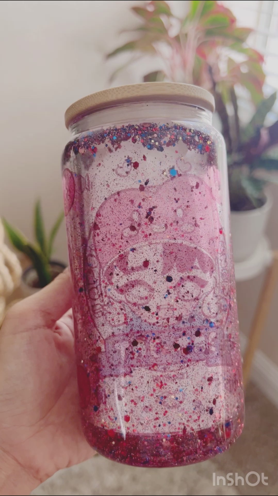 Info: Double-walled glass cup with a bamboo lid and glass straw. These cups are individually hand printed in our studio using a heated element and special inks. A silicone ring on the lid ensures a snug and comfortable, spill-proof fitment. Glitter solution is sealed inside with a silicone stopper and hardened resin.