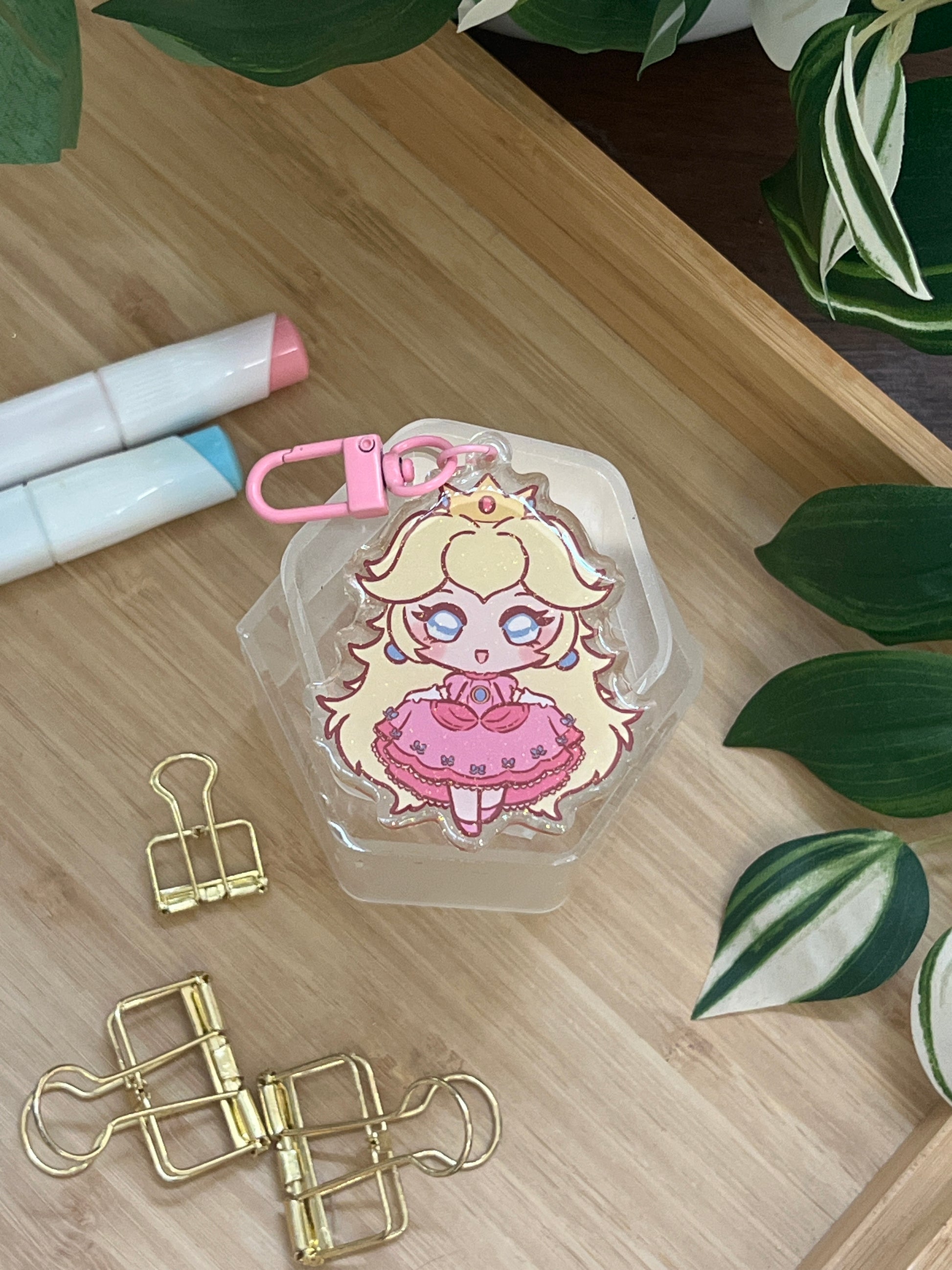 Info: Double-sided acrylic keychain with glitter epoxy doming for a sparkly finish. Comes with a pastel pink clasp.